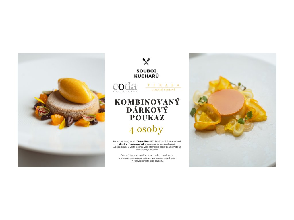Poukaz je platný na akci "Souboj kuchařů", která probíhá od 28.ledna do 31.března 2026 pro 4 osoby do obou restaurací.